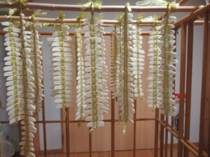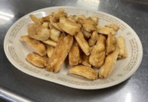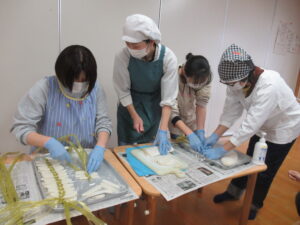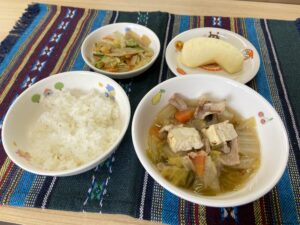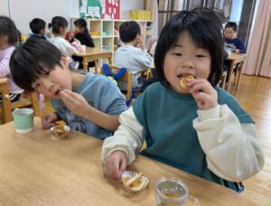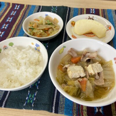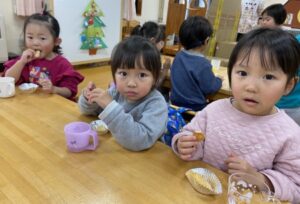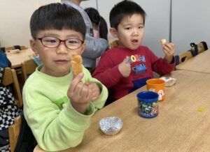 12月23日のメニュー 今日のこんだて 今日のこんだて ご飯 すき焼き風煮 ごぼうサラダ りんご ふりかけ 今日はもちつき大会で作ったお餅がおいしいおやつに大変身!硬くなったお餅を薄く切って、紐で結んで干しておく昔ながらのやり方で乾燥させたお餅を油で揚げて、素朴な味のおかきが出来上がりました。子どもたちは、もちつき大会の日から作ったお餅がどうなったのかとても楽しみにしている様子でした。サクサクの揚げたておかきをみんな喜んで食べました。 今日のこんだて 12月22日のメニュー前の記事
