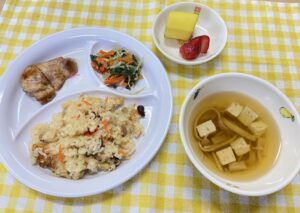 3月3日のメニュー 今日のこんだて 今日のこんだて 五目ごはん 照焼チキン お浸し すまし汁(えのき、豆腐、刻み麩) いちご、バナナ 今日のおやつ カルピスゼリー 今日のこんだて 3月2日のメニュー前の記事