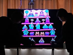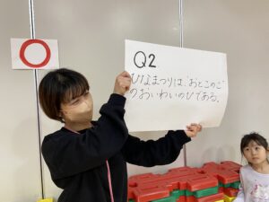 ブラックライトに浮かび上がる不思議なお雛様のおたのしみを見てから、お雛様の〇×クイズをしました。