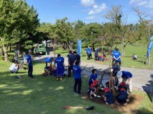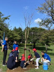 年長組が酒田東ロータリークラブの皆さんと一緒に日和山で桜の植樹を行いました。枯れてしまった桜の跡に植えた3本のソメイヨシノは来年には花を咲かせるそうです。お花見に行くのがとても楽しみです。