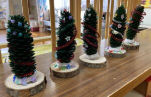 保全センターさんより用意していただいたドイツトウヒの松ぼっくりに、キラキラモールやビーズを付けてクリスマスツリーを作りました。