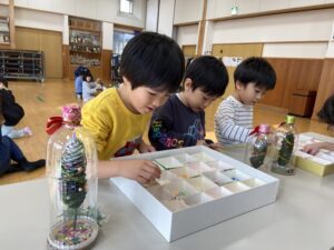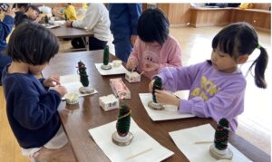 保全センターさんより用意していただいたドイツトウヒの松ぼっくりに、キラキラモールやビーズを付けてクリスマスツリーを作りました。