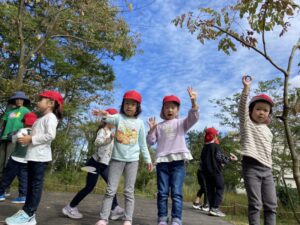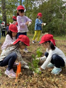 「みどりの保育園~森であそぼう~」今日はみんなが大好きなしんちゃんの森での活動です。はじめに去年のそらぐみさんが種まきして育ったグミの苗などを森に植樹しました。