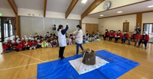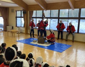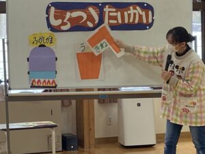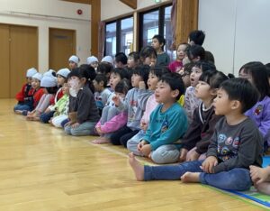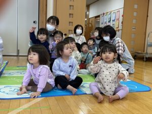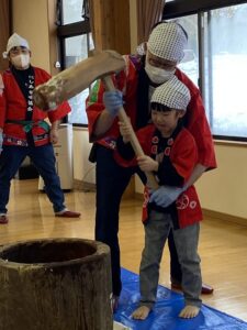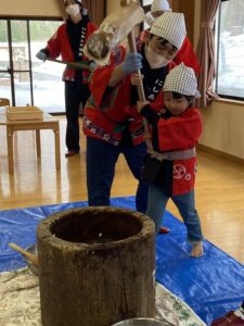 今年も残すところあとわずか。今日は餅つき大会です!餅つきのお話を聞いたり、手遊びをしたりして準備OK!