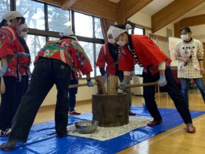 蒸かしたもち米をうすに入れて、ギュッギュッとつぶします。