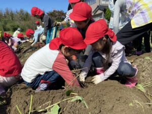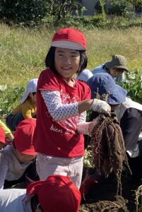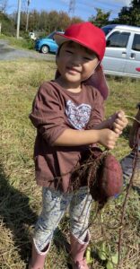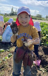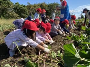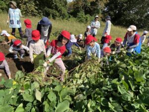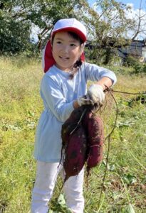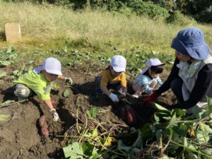 朝の雨が噓だったかのように晴れ渡り、さつま芋掘りに出かけました。力を合わせてつるを引っ張ったり、砂をかき分けてお芋を掘り出したり、一生懸命頑張る子ども達!